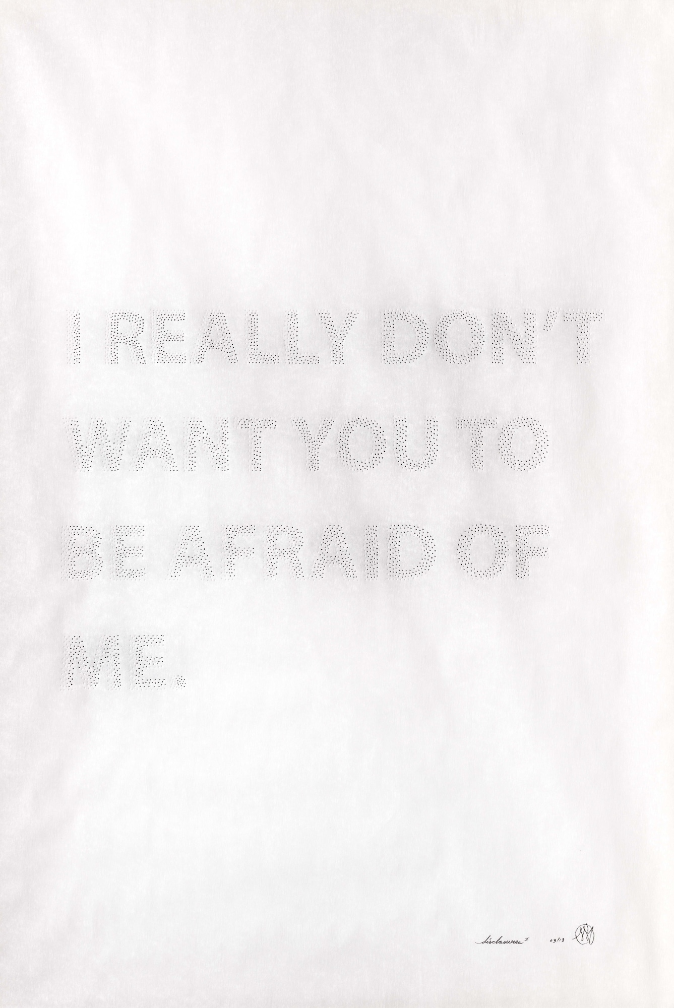 To create these works (first included in the Galleries' 2014 exhibition Re/Presenting HIV/AIDS, co-curated by Lia Newman, Rosemary Gardner, and Davidson professors Dr. Ann Fox and Dr. Dave Wessner), Kelley perforated sheets of semi-translucent parchment paper with a fine-point needle. The sheets were then layered over papers printed with the corresponding text. The layering and obfuscation may refer to disclosure itself, and one’s revealing something that is not easily seen, such as Kelley’s status. The use of the needle is a subtle reference to transmission, health, fragility, medicalization, and mortality.