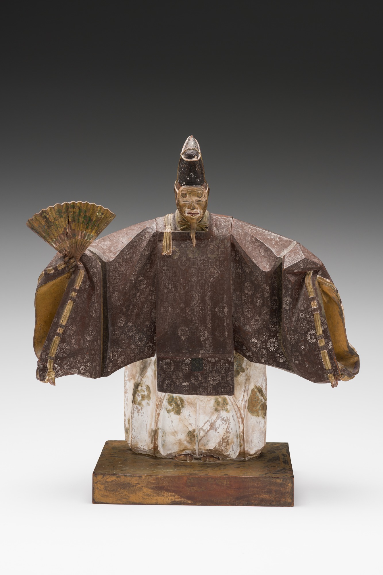 Noh theater began in the 14th century, unique to Japan, a musical drama that uses dancing and chanting to express the story. The plays often express the religious and spiritual values of the Japanese people. An art form in itself, you see Noh and Kabuki actors portrayed in art works from the Edo period (1615-1868). The masks worn during Noh performance were finely crafted and are very valuable to this day. The carved wooden figure in the Davidson collection is an old man holding a fan, the mask he wears is that of okino, a wise old man.