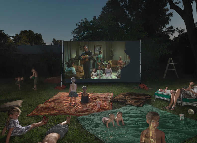 Julie Blackmon’s subjects are recreations of her experience of growing up in a large family, being a mother and photographer, and the timelessness of family dynamics. In her words: “The idea for Night Movie came to me when we were actually watching a movie outside with a projector set up. About every five seconds, one of the kids would get up to go get some more popcorn or a snack, and they’d block the screen with their silhouette. I remember thinking the way their little frames looked on the screen was way more interesting than the actual movie. And the idea of the movie screen mimicking life itself was also something I was thinking about.” Family dynamics play out in both the movie on the screen, Sound of Music, and her extended family scattered about the lawn.