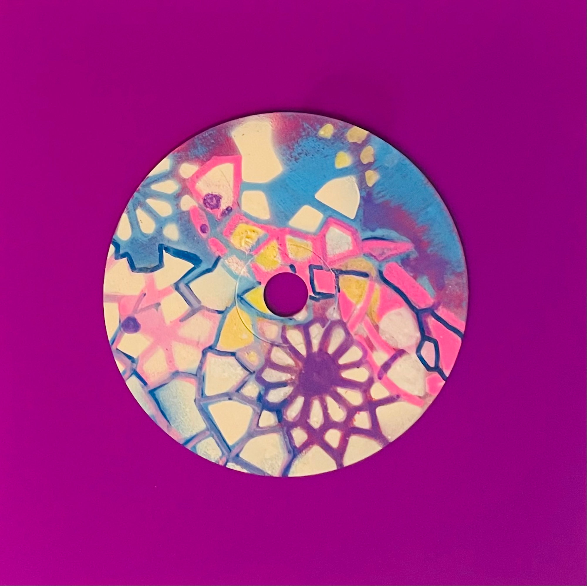 with organic forms in blues, purples, and pinks, featuring mandala elements overlaid