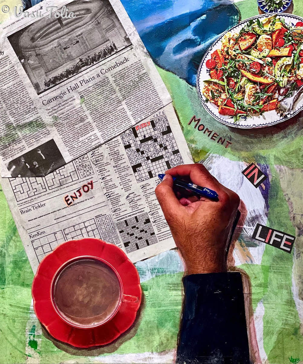 Retirement by Dr. Vasundhara (Vasu) Tolia  Image: A hand poised over the morning crossword, coffee in a bright red cup, a vibrant salad waiting nearby. The newspaper speaks of Carnegie Hall and world events, while the painted surface beneath whispers "ENJOY EVERY MOMENT IN LIFE"—a gentle reminder of what this stage promises.