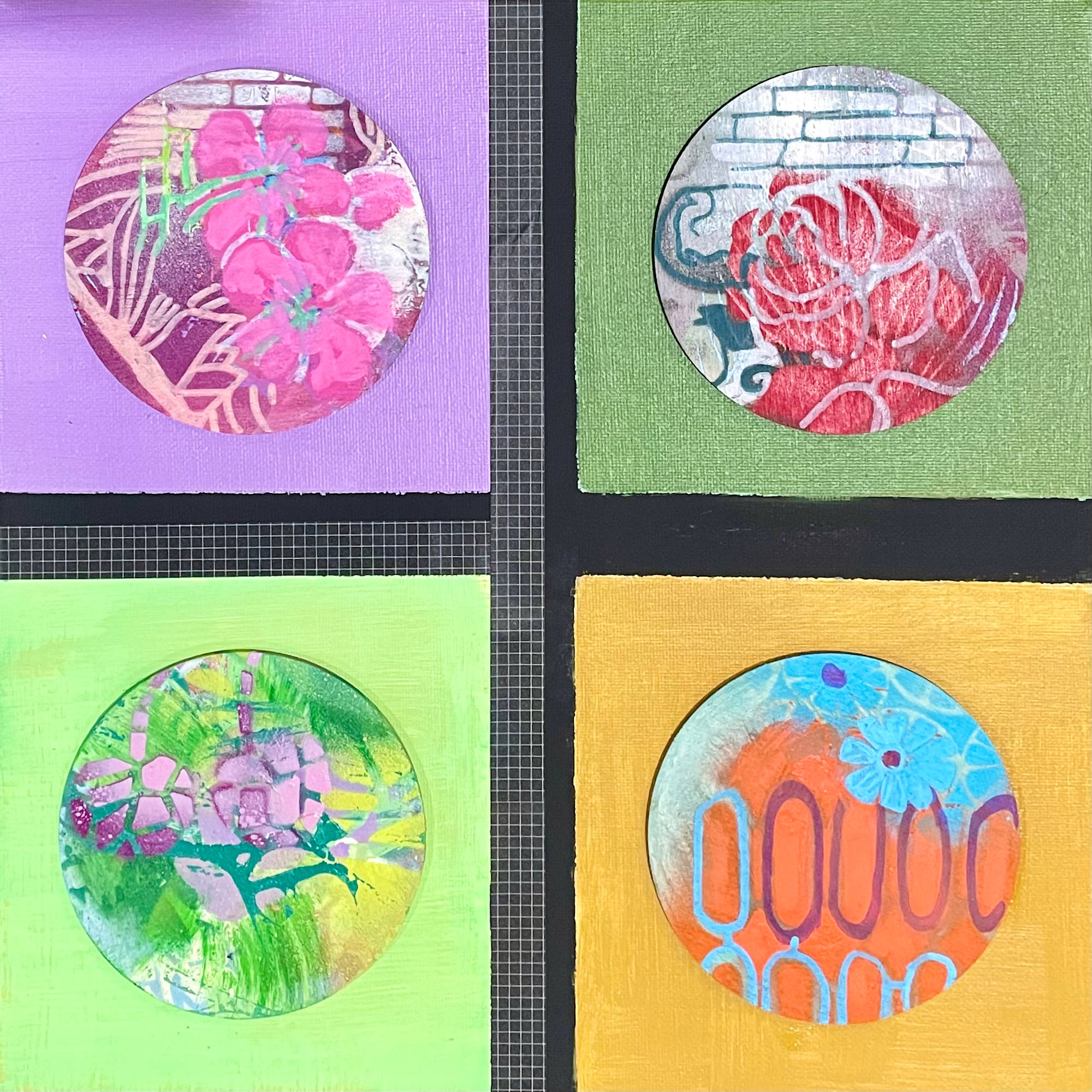 A composition of four circular elements, each set against square blocks of pastel colors—lavender, green, light green, and golden yellow. Inside each circle, we see abstract, floral designs with rich textures. The flowers seem to represent energy, growth, and nature, while the grid patterns evoke a sense of order and structure. This represents the balance between nature and structure.