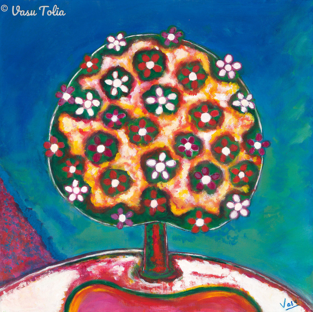 MessageThis is the fourth one of a series of tree paintings with different colored flowers and backgrounds. This is in vibrant blue, pink, white and green. I called this invigorating and imaginative series Tree of Life.