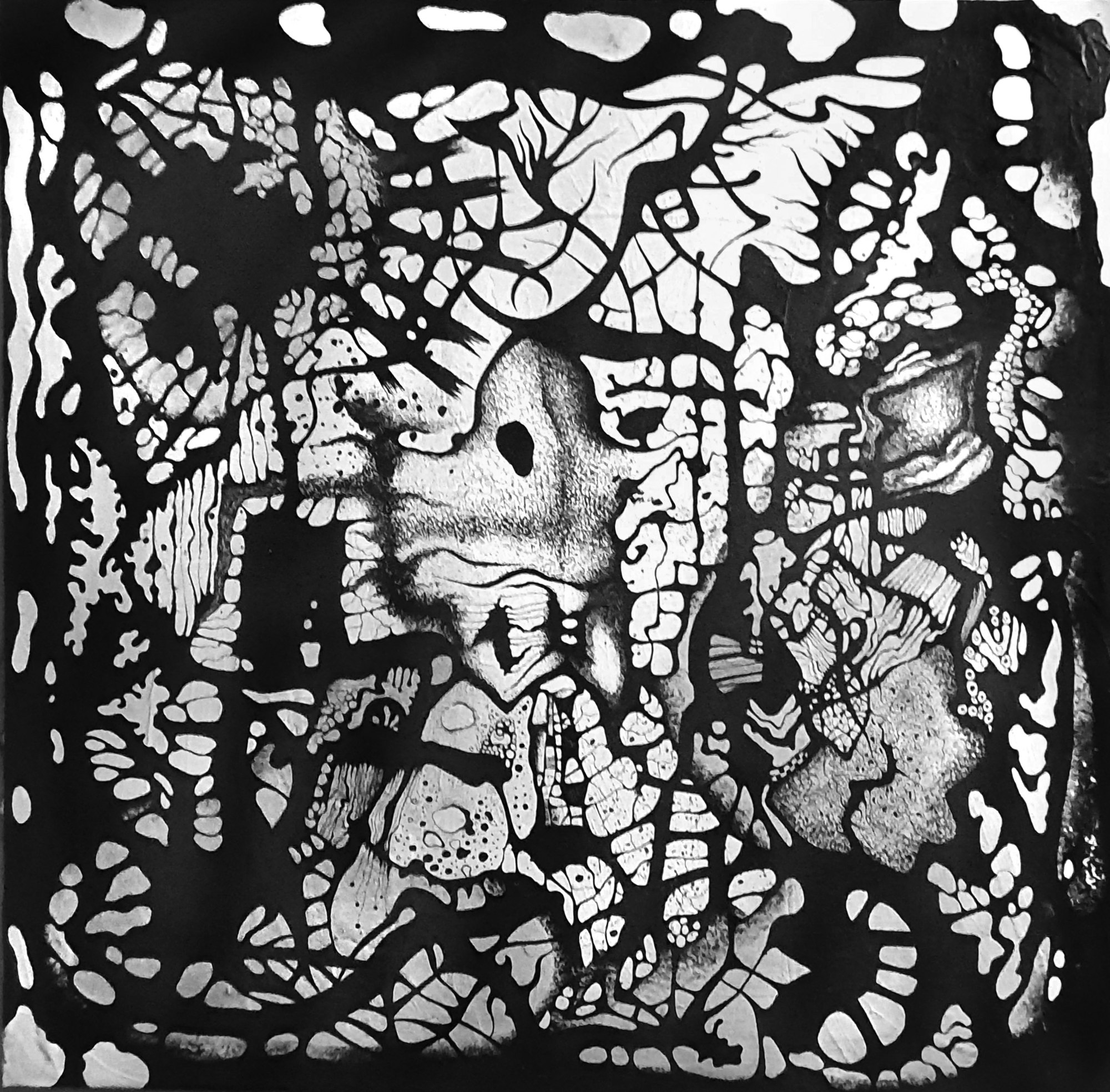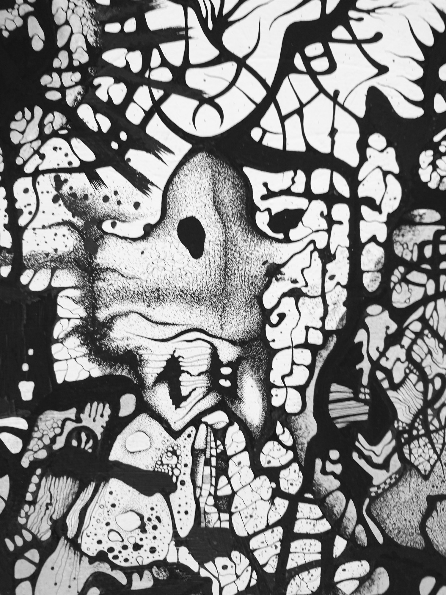 Hand-made work China ink, Rapidograph, pigment liners, white acrylics on board
