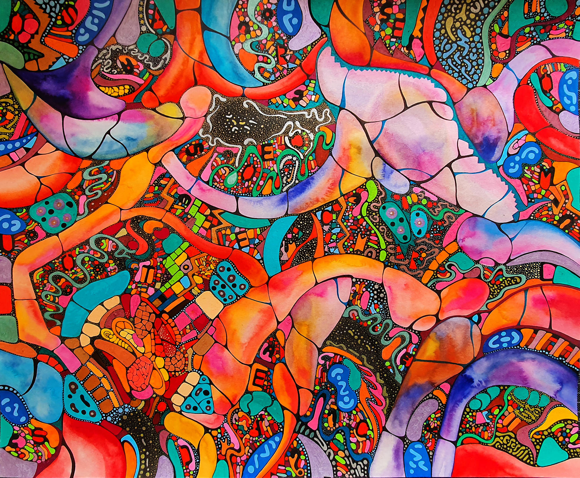 Water colors, acrylics, colored pencils, fine liners and metallic pens
