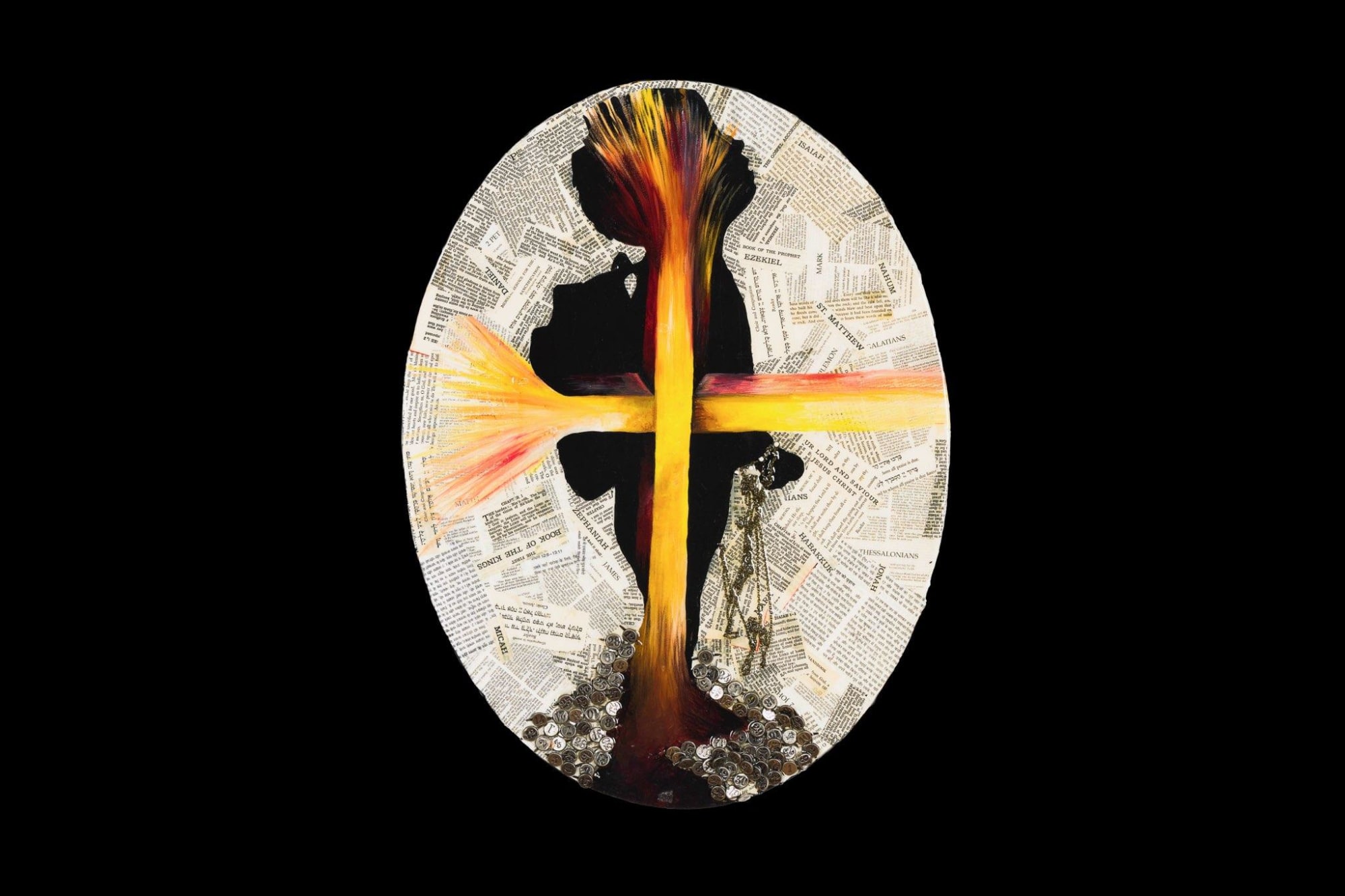 Oval shaped, Bible and Torah pages, found objects - found, feathers, chains, with resin cover