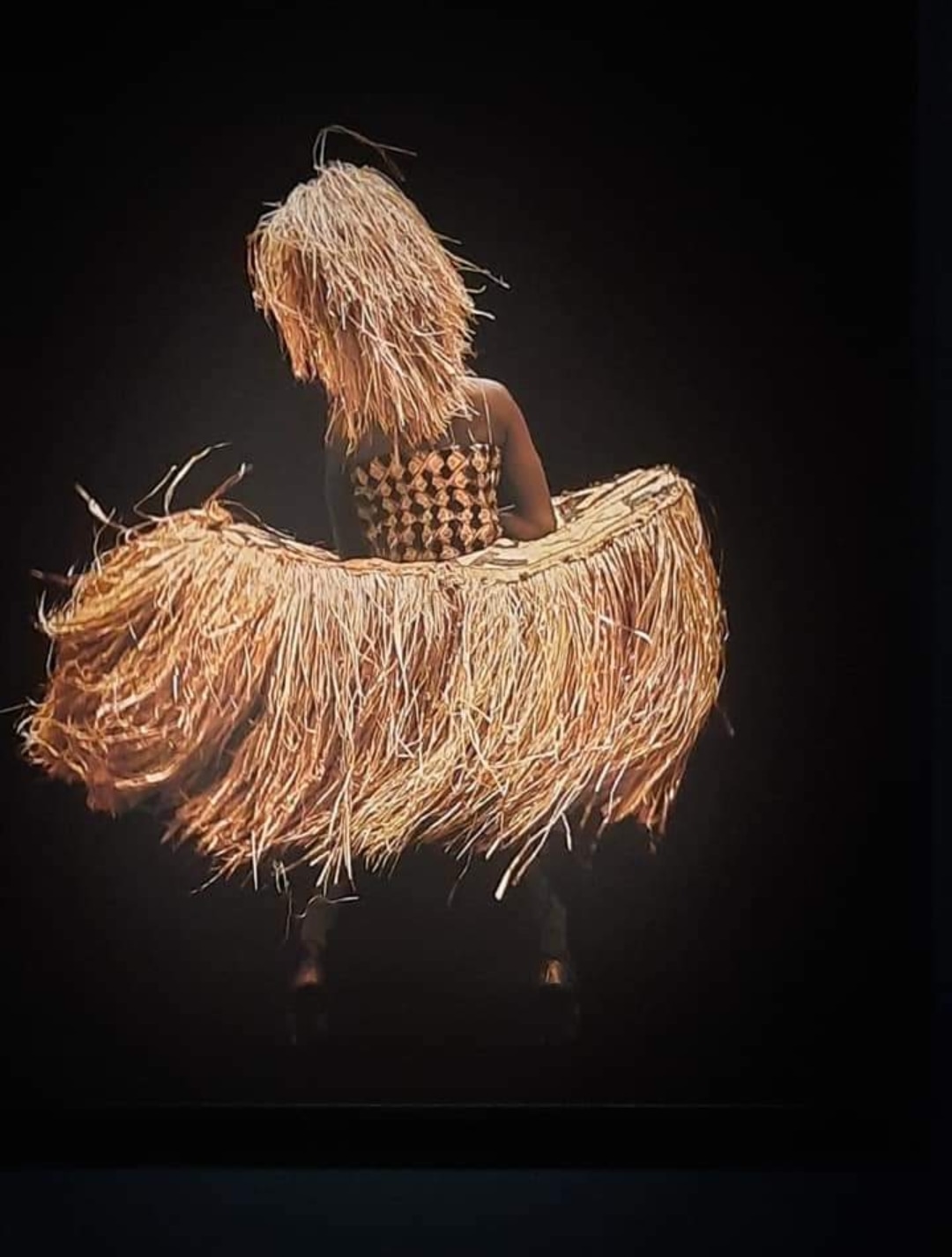 African themed, woman dancing in a raffia skirt.