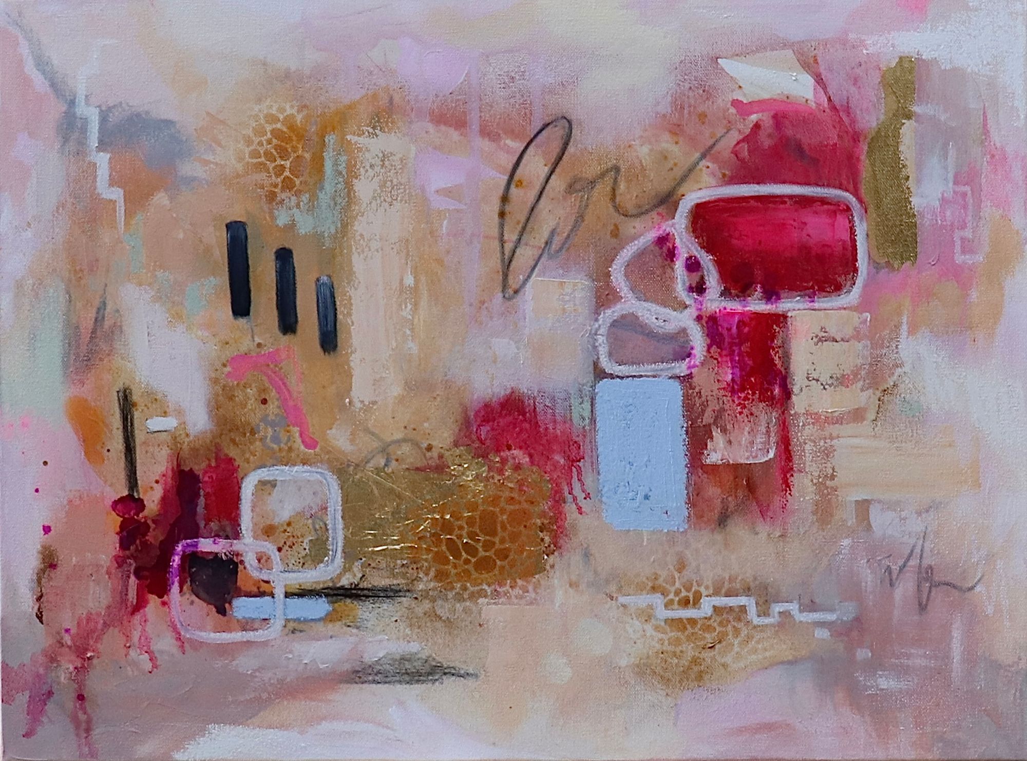 Soft Barriers by Elena Derksen  Image: Flowing pinks, golds, and reds form a warm palette of intimacy. Light blue and white structures attempt to organize the chaos, but the softness of the background resists containment. Like walls that remember touch, this piece evokes the impermanence of boundaries and the tenderness of becoming.