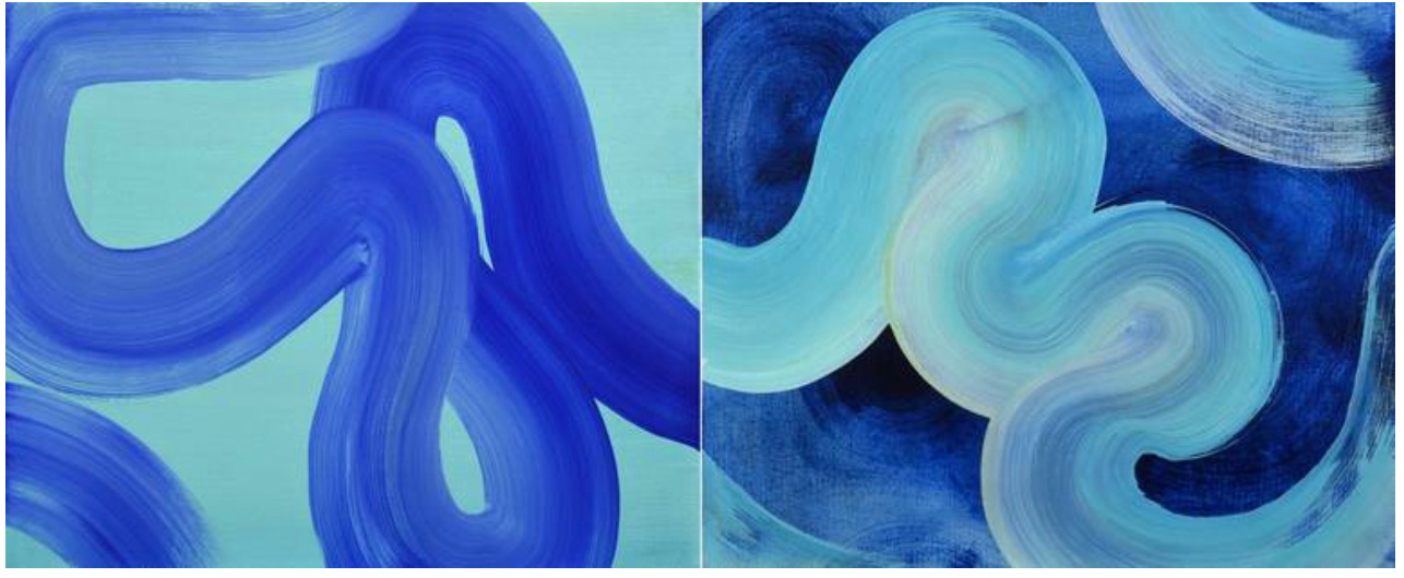 The beautiful flowing blue river running through day and night. The color of deep and turquoise blue wondering along in the vast land. Layers of oil brush marks on gessoed canvas board. Two individual panels. Each one is 16x20 inches. Altogether is 16x40 in. Ready to frame.