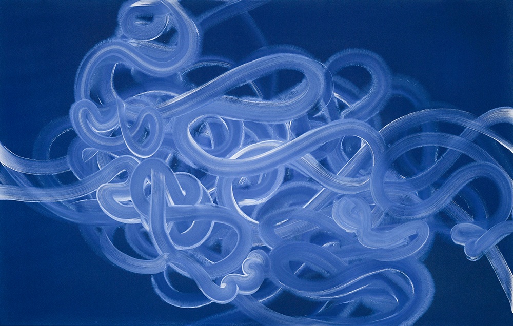 Layers of deep blue, lilac acrylic brush marks over gessoed ground canvas.