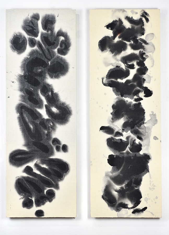 Profound Happiness. Acrylic on hemp canvas with silver color wash (on the left panel), mounted on two separated wood. Sold as an pair. Ready to hang. Each piece the dimension is 35.5 x 12 inches. The two panels can be displayed together or separately.