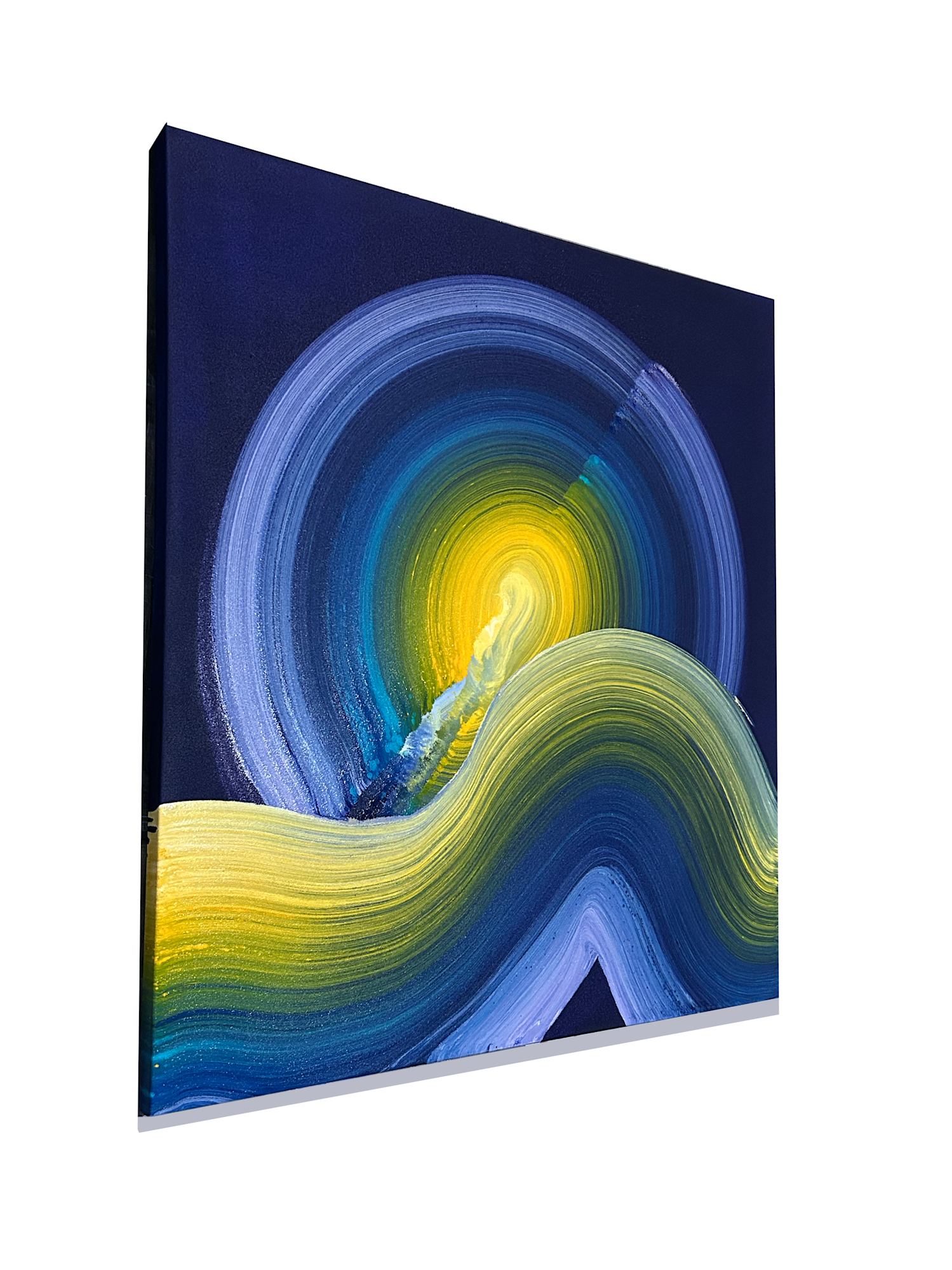 Tidal waves of the high and low tides, caused by the gravitational pull of the sun and moon. The natural, cyclical dance of the phenomenal world never ends. Layers of acrylic brush marks over gessoed canvas. Ready to hang.