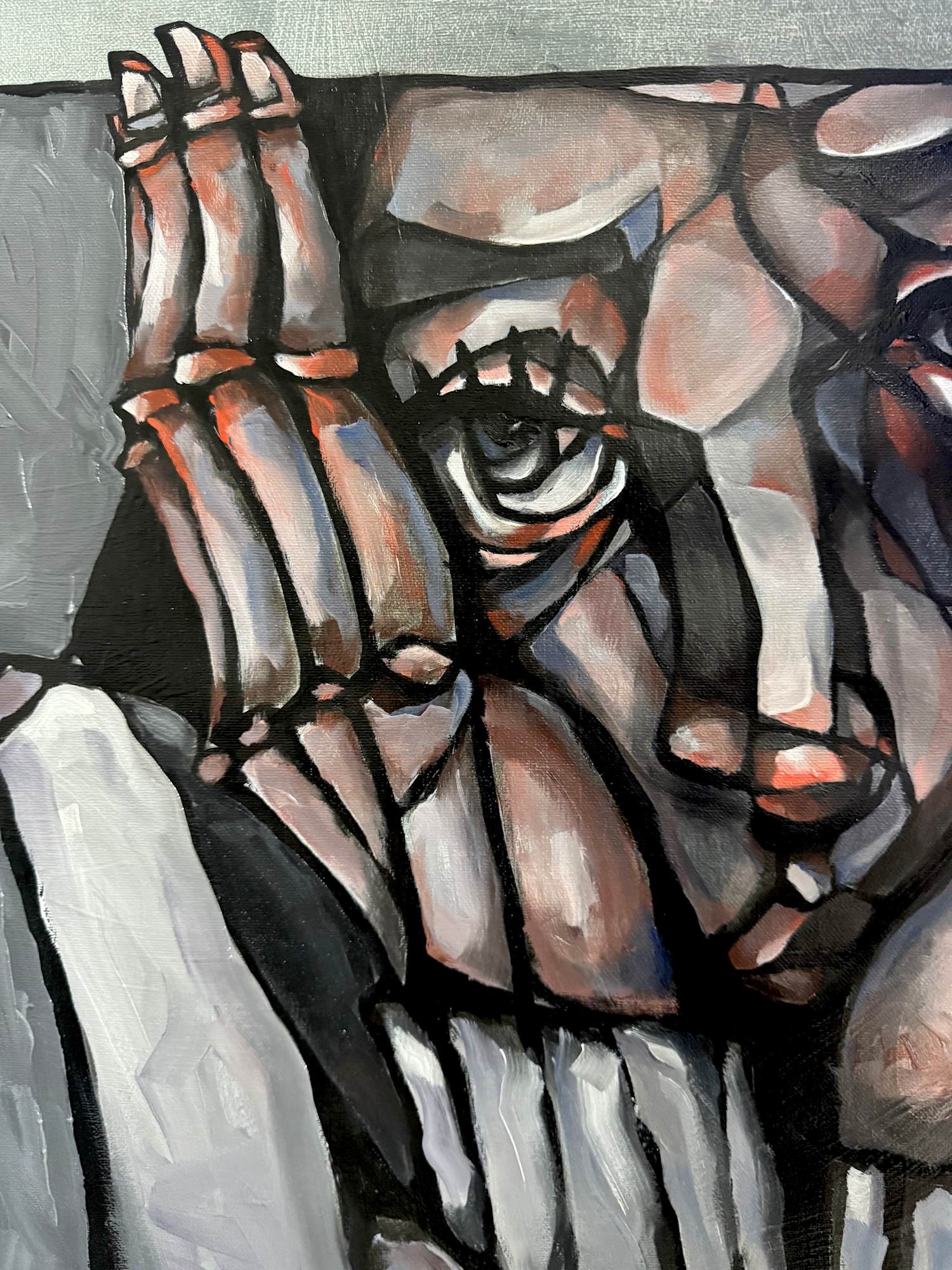 The direct gaze creates an uneasy connection with the viewer, while the surrounding hands introduce both support and restraint. This ambiguity—whether the figure is being held together or held in place—becomes central to the work’s tension.